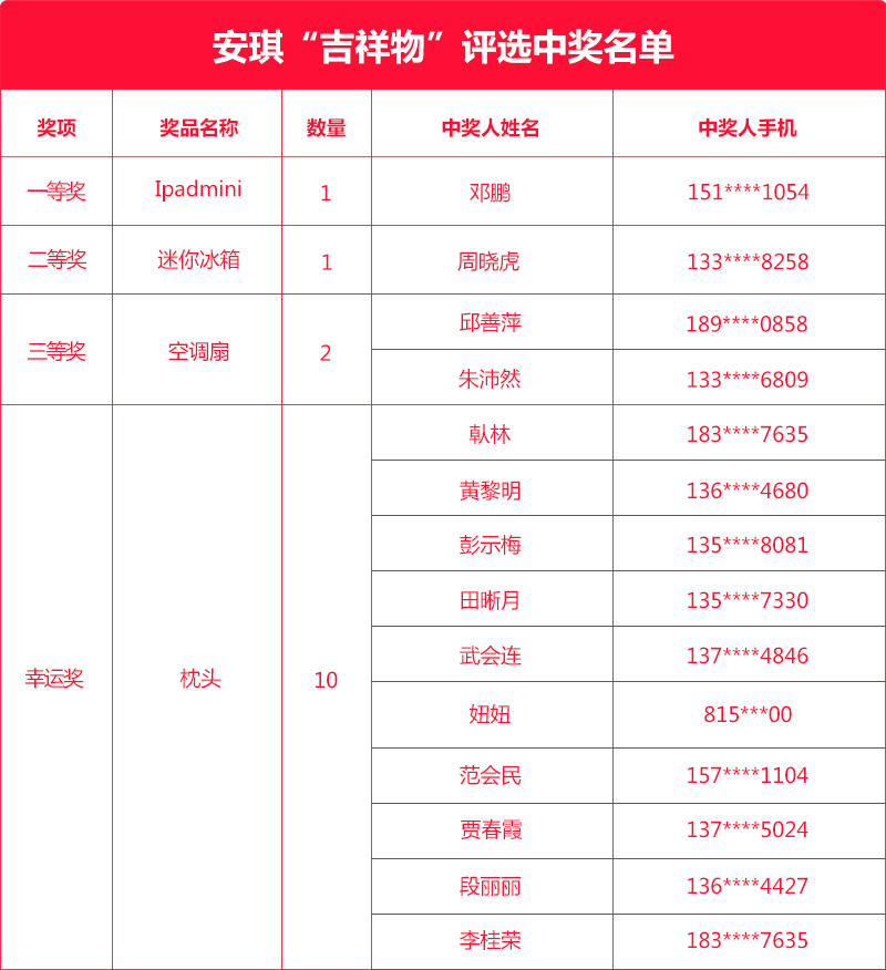 为了感谢各位宾客的参与和支持,北京安琪妇产医院于2015年8月30日在最后一场活动时进行了现场抽奖,因奖券由8个社区居民填写,抽奖时有些宾客未能来现场领奖,特将中奖名单于此公布,请您看到后尽快到院领奖。