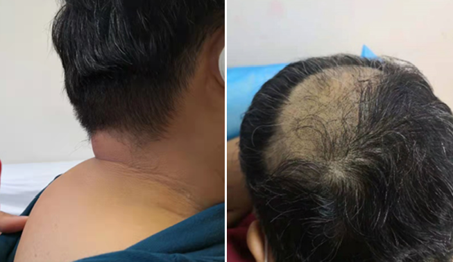 陈女士退休前在一家中药制药厂工作,常年伏案工作(负责中药包装),近些年出现颈肩僵硬不适,恶风寒,手指麻木。长期失眠伴心悸,近几个月出现严重脱发,头顶斑秃,头皮麻木胀痛感。图一可以看出颈部头夹肌损伤严重,颈部2、3、4、5关节横突压痛(+)。通过中药配合针刀治疗脱发明显改善。睡眠质量提高,心悸手麻的伴随症状基本消失。